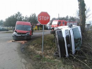 35-letni mieszkanie Zduńskiej Woli, kierując samochodem marki Vw Crafter, wjeżdżając na drogę z pierwszeństwem nie zatrzymał pojazdu w związku ze znakiem STOP. Doprowadził tym do zderzenia z pojazdem marki Citroen Jumper, kierowanym przez 28-letniego mieszkańca Piotrkowa Trybunalskiego. Obaj kierowcy byli trzeźwi.
