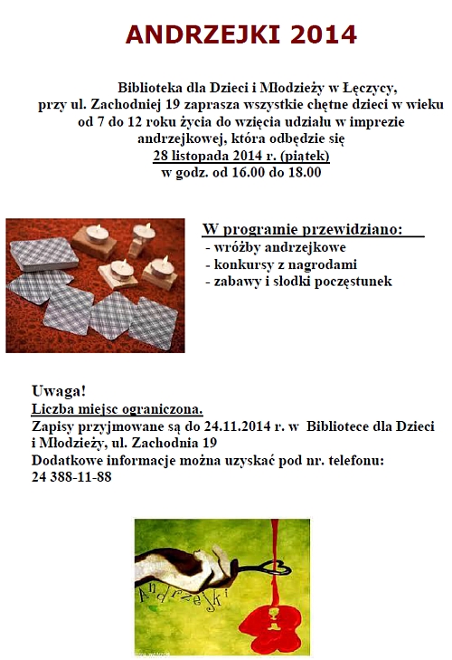 AktualnościBiblioteka dla Dzieci i Młodzieży w Łęczycy, przy ulicy Zachodniej 19 zaprasza wszystkie chętne dzieci w wieku 7 do 12 lat, do wzięcia udziału w imprezie andrzejkowej, która odbędzie się 28 listopada w godzinach 16:00 do 18:00.Uwaga!Liczba miejsc ograniczona. Zapisy przyjmowane są do 24 listopada w Bibliotece dla Dzieci i Młodzieży.