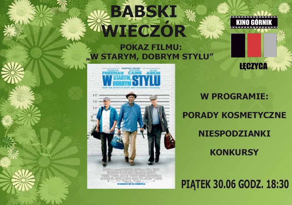 AktualnościKINO GÓRNIK zaprasza 30.06.2017, na kolejny BABSKI WIECZÓR, a w nim na uroczą lekką komedię z doborową obsadą hollywoodzkich panów pt. " W starym dobrym stylu", godz. 18:30Przed seansem Panie będą mogły sprawdzić analizę składu swojego ciała oraz wylosować ciekawe nagrody tzw.szczęśliwe fotele".Serdecznie zapraszamy.