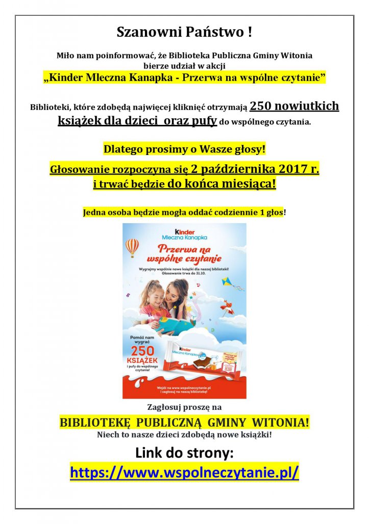 Biblioteka Publiczna Gminy Witonia prosi o głosy w ramach akcji „Kinder Mleczna Kanapka – Przerwa na wspólne czytanie”