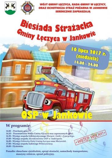 Aktualności16 lipca (niedziela) o godzinie 14:00 w siedzibie Ochotniczej Straży Pożarnej w Jankowie rozpocznie się Biesiada Strażacka Gminy Łęczyca, na którą gorąco zapraszają wójt Jacek Rogoziński, radni gminy Łęczyca oraz strażacy. W programie: 14:00 – Powitanie gości14:10 – Przemówienie Wójta Gminy Łęczyca oraz zaproszonych gości14:30 – Występ zespołu folklorystycznego Marysie i Jaśki z Łyncyckigo15:00 – Występ akordeonistów z OSP w Andrespolu16:00 – Występ Orkiestry Dętej Gminy Łęczyca oraz Mażoretek17:00 – Występ zespołu ludowego Witaszewiacy18:00 – DyskotekaPonadto: dmuchane zjeżdżalnie, wystawa sprzętu strażackiego, samochodów transportowych, maszyn rolniczych oraz sprzętu policyjnego.Wstęp wolny.