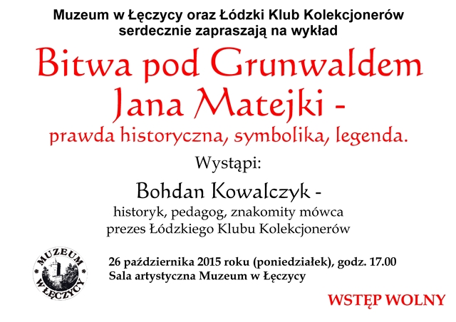AktualnościMuzeum w Łęczycy oraz Łódzki Klub Kolekcjonerów serdecznie zapraszają na wykład "Bitwa pod Grunwaldem Jana Matejki - prawda historyczna, symbolika, legenda".Wystąpi: Bohdan Kowalczyk - historyk, pedagog, znakomity mówca, prezes Łódzkiego Klubu Kolekcjonerów.Spotkanie odbędzie się 26 października o godzinie 17 w sali artystycznej Muzeum w Łęczycy. Wstęp wolny.