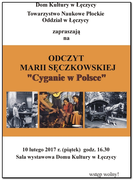 AktualnościDom Kultury w Łęczycy oraz Towarzystwo Naukowe Płockie Oddział w Łęczycy zapraszają na odczyt Marii Sęczkowskiej pt. "Cyganie w Polsce".Odczyt będzie miał miejsce 10 lutego o godzinie 16.30 w sali wystawowej Domu Kultury.