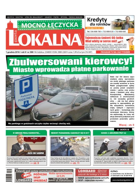 AktualnościJuż jest nowy numer "Gazety Lokalnej"! W numerze: Zbulwersowani kierowcy! Miasto wprowadza płatne parkowanie, Piłka nożna kontra lekkoatletyka. Burmistrz opuszcza obrady, Reforma edukacji zrujnuje placówkę?, Sekundy na ratunek! Na ulicy pomogli obcy ludzie, Tajemnicza śmierć 66-latka. Miał wbity w serce nóż!Do tego największa kutnowska giełda pracy, autogiełda, dodatek sportowy oraz program telewizyjny w prezencie!Gazeta Lokalna! Blisko Twoich spraw! Cena 1,99 zł!Wejdź na stronę www.gazetalokalna.comi czytaj najnowsze artykuły!Kup wydanie elektroniczne na eGazety.pl