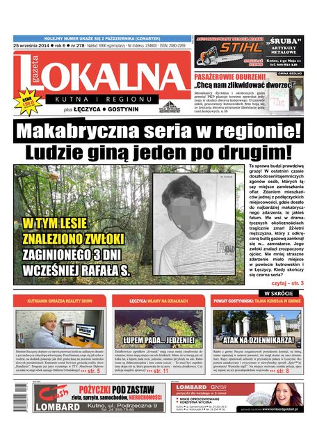 AktualnościJuż jest nowy numer "Gazety Lokalnej"! W numerze: Śmiertelna seria w regionie! Tajemnicze zgony elektryzują mieszkańców!, Nieprawidłowości w SOSW? Dyrektorka pod lupą rzecznika dyscyplinarnego, Kutnianka kontra były pracodawca, Kutnianin gwiazdą reality show, Grupie Teatralnej "od jutra" stuknęła 30-stka, Posiedzenie komisji nie dla mieszkańców Gminy Pacyna?, Włamy na działkach. Łupem pada... jedzenie!, Pasażerowie oburzeni! "Chcą nam zlikwidować dworzec", Rywalizowali o Różę Kutna.Do tego największa kutnowska giełda pracy, autogiełda, dodatek sportowy oraz program telewizyjny w prezencie!Gazeta Lokalna! Blisko Twoich spraw! Cena 1,90 zł!Wejdź na stronę www.gazetalokalna.comi czytaj najnowsze artykuły!Kup wydanie elektroniczne na eGazety.pl