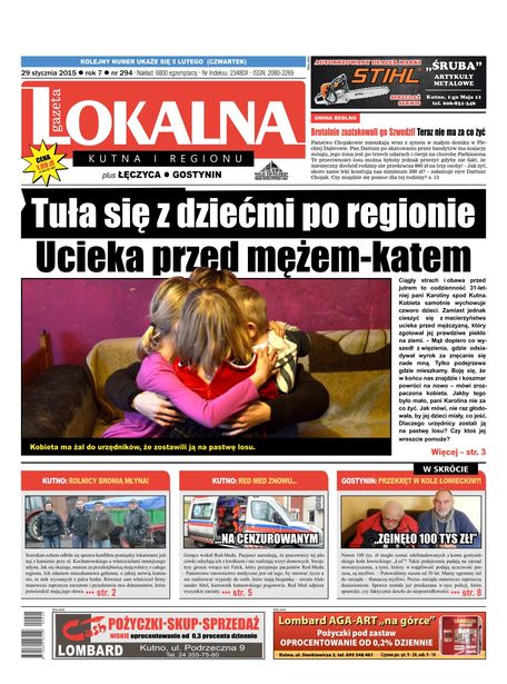 AktualnościJuż jest nowy numer "Gazety Lokalnej"! W numerze: Tuła się po regionie. Ucieka przed mężem-katem, Rolnicy bronią młyna! Konflikt zakończy się w sądzie?!, Uważaj! Oszuści czyhają na każdym kroku!, Red Med znowu na cenzurowanym. Posypały się skargi do NFZ, Tylman i Majewski spisali się śpiewająco, Gruby przekręt w kole łowieckim?! "Zginęło 100 tys zł!", Afera Zieleni Miejskiej. Pracownicy się zbuntowali!, Brutalnie zaatakowali go Szwedzi! Teraz nie ma za co żyć, Udany rewanż Polpharmy. Polfarmex na kolanach.Do tego największa kutnowska giełda pracy, autogiełda, dodatek sportowy oraz program telewizyjny w prezencie!Gazeta Lokalna! Blisko Twoich spraw! Cena 1,99 zł!Wejdź na stronę www.gazetalokalna.comi czytaj najnowsze artykuły!Kup wydanie elektroniczne na eGazety.pl