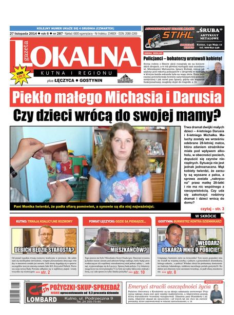 AktualnościJuż jest nowy numer "Gazety Lokalnej"! W numerze: Piekło małego Michałka i Darusia. Czy dzieci wrócą do swojej mamy?, Powiatowa koalicja się klaruje, Podaruj potrzebującym Szlachetną Paczkę, Kto zamordował Helę?, Burmistrz kontra dziennikarz! "Włodarz oskarża mnie o pobicie!", Gmina Daszyna: Radny uciekł z pieniędzmi?, Policjanci - bohaterzy uratowali kobietę!, Kraksa pod Kutnem. Dwie osoby w szpitalu, Horror z happy endem dla Polfarmexu.Do tego największa kutnowska giełda pracy, autogiełda, dodatek sportowy oraz program telewizyjny w prezencie!Gazeta Lokalna! Blisko Twoich spraw! Cena 1,90 zł!Wejdź na stronę www.gazetalokalna.comi czytaj najnowsze artykuły!Kup wydanie elektroniczne na eGazety.pl
