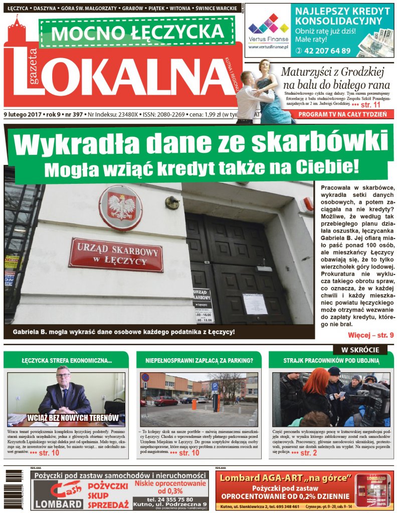 Aktualnościuż jest nowy numer "Gazety Lokalnej"! W numerze:Strajk pracowników pod kutnowską ubojnią, Narkotykowy baron zatrzymany, "Niezabudka" kontra matka, Walka dorosłych, cierpienie niepełnosprawnego, Wykradła dane ze skarbówki! Mogła wziąć kredyt także na Ciebie!, "Pietrzak Holding" wykupiony. Będą nowe miejsca pracy?!, Szczęśliwa trzynastka. Polfarmex wygrywa w KoszalinieDo tego największa kutnowska giełda pracy, autogiełda, dodatek sportowy oraz program telewizyjny w prezencie!Gazeta Lokalna! Blisko Twoich spraw! Cena 1,99 zł! Kup wydanie elektroniczne na eGazety.pl