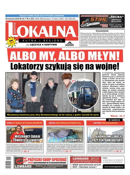 AktualnościJuż jest nowy numer "Gazety Lokalnej"! W numerze: Albo My, albo Młyn! Lokatorzy szykują się na wojnę!, Świerzb w DPS-ie? Zdanie dyrekcji to pomówienia, Walczy o lepsze warunki dla chorej córki, Czy skończy się tułaczka sercowców? Mieszkańcy naciskają ws. Allenort na NFZ, Dzieciaki bawiły się w rytmach dżungli, Fekalia na klatkach! Alkoholowe libacje przy centrum kultury!, Szok! Seksualnie wykorzystują biednych, Slalomem przez Toruńską, Udany rewanż Polfarmexu. Rosa pokonana. Do tego największa kutnowska giełda pracy, autogiełda, dodatek sportowy oraz program telewizyjny w prezencie!Gazeta Lokalna! Blisko Twoich spraw! Cena 1,99 zł!Wejdź na stronę www.gazetalokalna.comi czytaj najnowsze artykuły!Kup wydanie elektroniczne na eGazety.pl