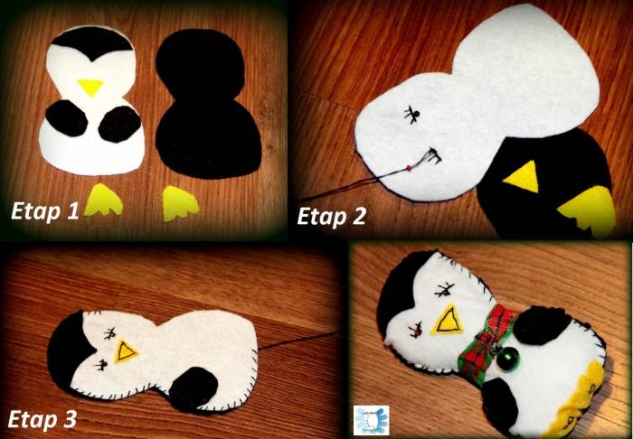 Teraz należy przyszyć pingwinkowi nóżki oraz udekorować jego szyję ozdobną tasiemką. Pingwinek na obrazku 4 posiada także koralik z dzwoneczkiem, który jest miłym akcentem tejże ozdoby świątecznej.