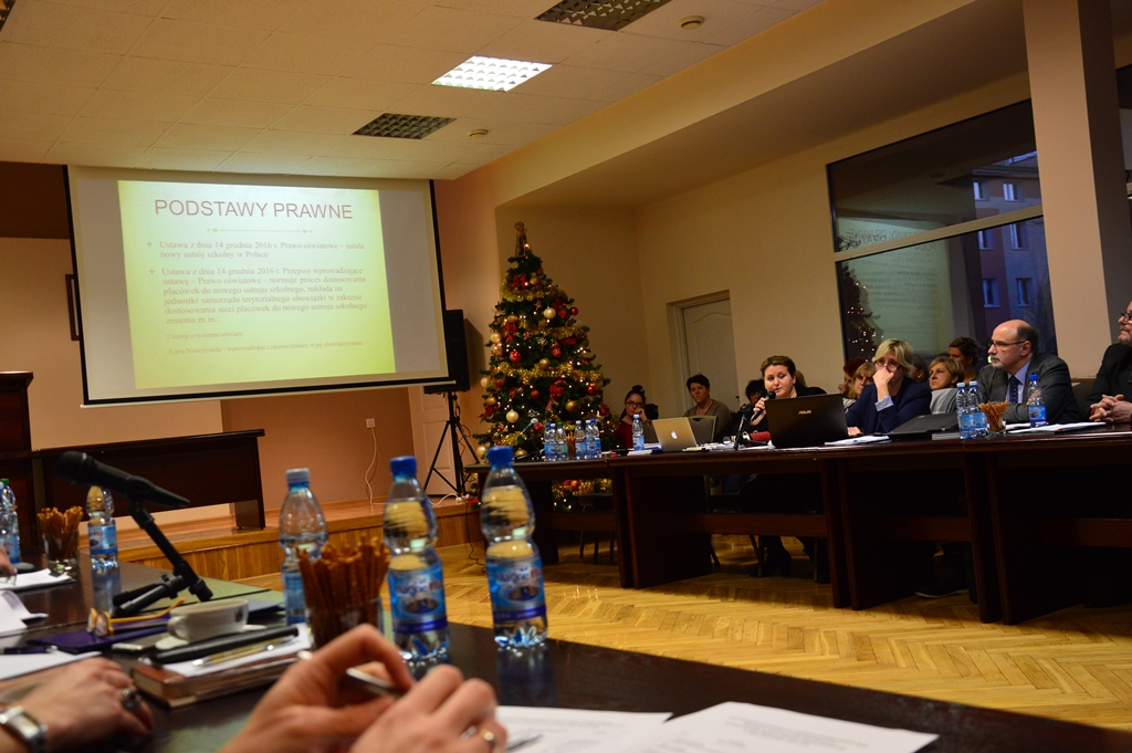 Irena Gut-Leśkiewicz pełnomocnik burmistrza ds. oświaty zaprezentowała zebranym dwie, wstępne koncepcje. Pierwsza z nich to włączenie gimnazjum do szkoły podstawowej nr 3 i zlokalizowanie jej w dwóch budynkach. Wyglądać by to miało tak, że dzieci klas 1-4 uczęszczają do budynku na ulicy Zachodniej, natomiast klasy 5-8 „przenoszą” się do budynku na ulicy Szkolnej.