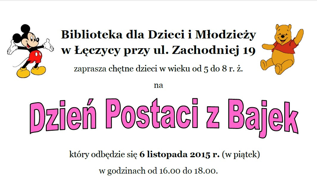 Aktualności6 listopada w godzinach od 16 do 18 w Bibliotece dla Dzieci i Młodzieży w Łęczycy przy ul. Zachodniej 19 odbędzie się Dzień Postaci z Bajek.W programie imprezy przewidziano zagadki, łamigłówki, kalambury, zabawy taneczne, quiz i słodki poczęstunek. Zabawa adresowana jest do dzieci w wieku od 5 do 8 roku życia. Udział w imprezie jest bezpłatny. Liczba miejsc jest ograniczona, a zapisy przyjmowane są przez placówkę do 30 października. Więcej informacji pod numerem telefonu: 24 388-11-88.