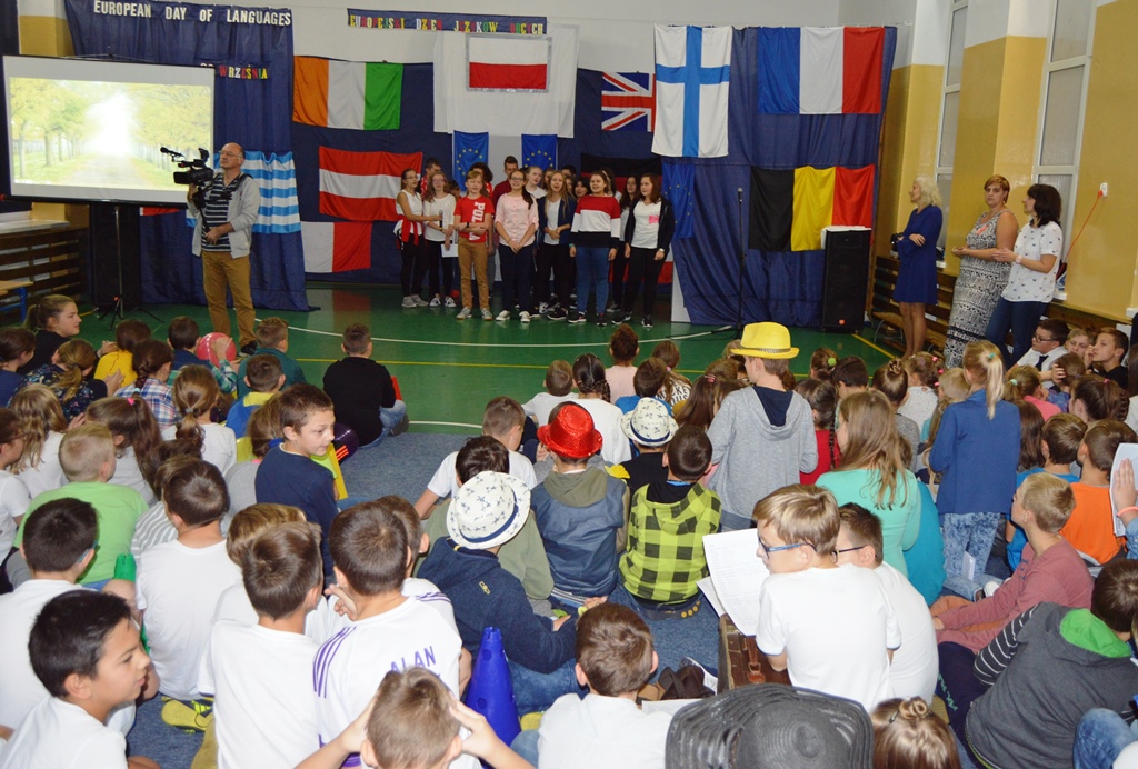 Na sali gimnastycznej odbyła się spontaniczna i pełna pozytywnej energii zabawa. Uczniowie klas 5-7 przedstawiali scenki, prezentacje, piosenki w różnych językach. Mieszały się dźwięki włoskie, czeskie, portugalskie, rosyjskie i inne. W przerwach między występami publiczność miała do wykonania zadania, typu liczenie do 10 w różnych językach, wspólne śpiewanie „Panie Janie” w kilku językach, odgadywanie języków usłyszanych w piosence.
