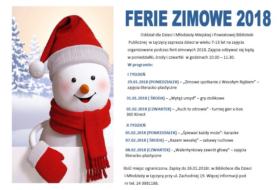 AktualnościOddział dla Dzieci i Młodzieży Miejskiej i Powiatowej Biblioteki Publicznej w Łęczycy zaprasza dzieci w wieku 7-13 lat na zajęcia organizowane podczas ferii zimowych 2018. Zajęcia odbywać się będą w poniedziałki, środy i czwartki w godz. 10.00 – 11.30.