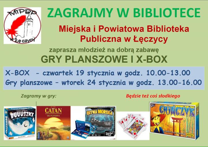 AktualnościW czasie ferii MiPBP zaprasza dzieci i młodzież na granie w bibliotece.19 stycznia bawiono się z konsolą X-BOX, natomiast 24 stycznia będzie dniem gier planszowych. W dni powszednie oprócz czwartków można również skorzystać z komputerów i tabletów podłączonych do Internetu.