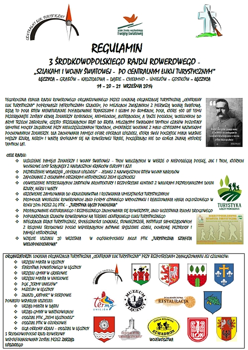 AktualnościLokalna Organizacja Turystyczna "Centralny ŁUK Turystyczny" serdecznie zaprasza do udziału w III Środkowopolskim Rajdzie Rowerowym "Szlakami I Wojny Światowej". Impreza patriotyczno – turystyczna odbędzie się bez względu na warunki atmosferyczne (zakładając najlepszy wariant złotej polskiej jesieni) w dniach 19-21 września 2014 na obszarze województw łódzkiego i wielkopolskiego.Regulamin Rajdu Karta zgłoszenia