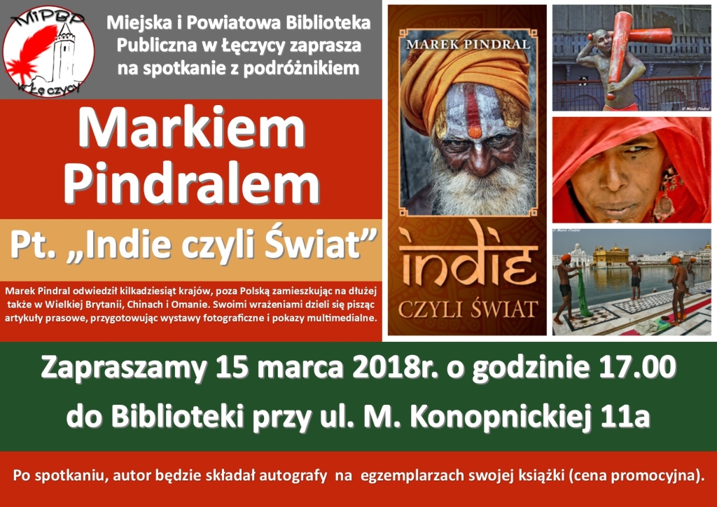 AktualnościW najbliższy czwartek, 15 marca br., Miejska i Powiatowa Biblioteka Publiczna w Łęczycy gościć będzie znanego już mieszkańcom Królewskiego Miasta podróżnika Marka Pindrala.