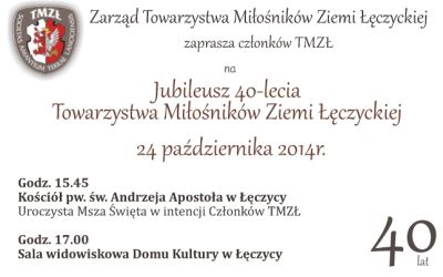 AktualnościZarząd Towarzystwa Miłośników Ziemi Łęczyckiej zaprasza członków TMZŁ na Jubileusz 40-lecia Towarzystwa Miłośników Ziemi Łęczyckiej, który odbędzie się w piątek, 24 października.Program obchodów:15:45 - Uroczysta Msza Święta w intencji członków TMZŁ - Kościół pw. św. Andrzeja Apostoła w Łęczycy17:00 - Sala widowiskowa Domu Kultury w Łęczycy