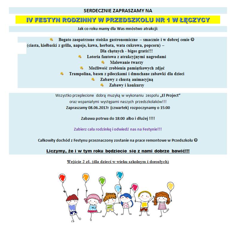AktualnościJuż czwarty raz w Przedszkolu nr 1 odbywać się będzie festyn rodzinny. Tegoroczny festyn wplata się wspaniale w realizowany przez przedszkole Projekt ekologiczny "Pszczoła - maleńka istota, bez której zginie świat" i przebiegać będzie pod hasłem "Mały i duży Łęczycanin z ekologicznych zachowań jest znany". Na uczestników czeka wiele wspaniałych atrakcji: loteria fantowa, malowanie twarzy, trampoliny, dmuchańce, konkursy z nagrodami i pyszne jedzonko.Zapraszamy wszystkich chętnych do udziału w święcie i wspaniałej zabawie.Start o godzinie 15:00.