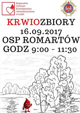Aktualności16 września (sobota) w godzinach 9:00 – 11:30 w siedzibie Ochotniczej Straży Pożarnej w Romartowie odbędą się kolejne krwiozbiory.Na krwiodawców, oprócz satysfakcji z powodu podzielenia się cennym płynem, czekają również niespodzianki takie jak: - bilet do kina Helios Płock- wejściówki Zoo Płock- 200 zł rabat kurs prawa jazdy- pizza z łęczyckiej 13-stki - wpisowe 0 zł do Wyższej Szkoły Gospodarki Krajowej w Kutnie (normalnie wynosi ono 85 zł)- obiad w Basiorze- bon o wartości 15 zł do pizzerii Rozana w Kutnie