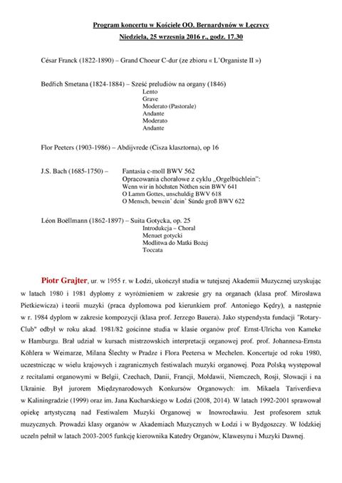 AktualnościW niedzielę 25 września o godzinie 17.30 zapraszamy do kościoła ojców Bernardynów w Łęczycy na koncert organowy w mistrzowskim wykonaniu Piotra Grajtera, profesora Akademii Muzycznej im. Grażyny i Kiejstuta Bacewiczów w Łodzi, podczas którego zaprezentowane będą najpiękniejsze utwory z literatury organowej od baroku po współczesność. Profesor Piotr Grajter jest korzeniami rodzinnymi związany z Łęczycą, bowiem stąd pochodziła jego Matka i w dzieciństwie i młodości wielokrotnie odwiedzał nasze miasto. Będzie to również dodatkową atrakcją dla łęczyckiej publiczności, a dla młodych słuchaczy może być zachętą do rozpoczęcia lub pogłębiania nauki gry na instrumentach muzycznych.Koncert z pewnością pozostanie na długo w pamięci nie tylko melomanów, ale również osób, które po raz pierwszy będą miały okazję posłuchać arcydzieł muzyki organowej w znakomitym wykonaniu i w pięknym wnętrzu łęczyckiej świątyni. Pragniemy zwrócić uwagę, że koncert rozpocznie się nieco inaczej niż zazwyczaj, czyli przed wieczornym nabożeństwem, a nie po nim. Przewidywany czas trwania koncertu ok. 50 minut. Może okaże się to dogodniejszą porą na jesienne spotkanie z muzyką. Zapraszamy!!!