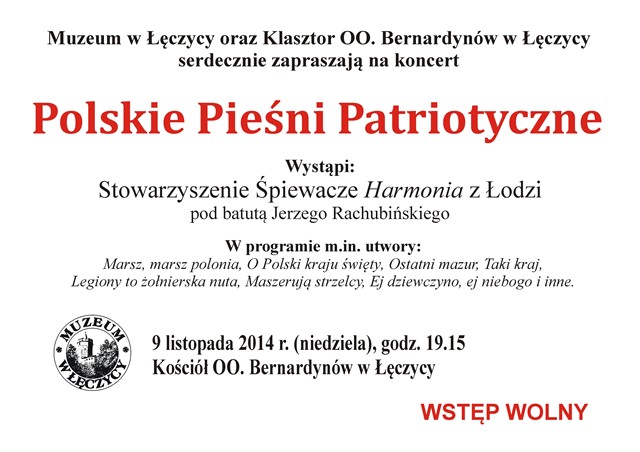 AktualnościMuzeum w Łęczycy oraz Klasztor OO. Bernardynów w Łęczycy serdecznie zapraszają na koncert Polskie Pieśni Patriotyczne, który odbędzie się w niedzielę, 9 listopada, o godz. 19:15. Wystąpi Stowarzyszenie Śpiewaczy Harmonia z Łodzi pod batutą Jerzego Rachubińskiego.
