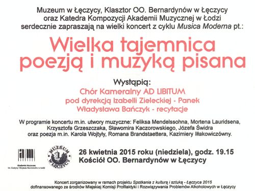 AktualnościMuzeum w Łęczycy, Klasztor OO. Bernardynów w Łęczycy oraz Katedra Kompozycji Akademii Muzycznej w Łodzi serdecznie zapraszają na wielki koncert z cyklu Musica Modema pt. "Wielka tajemnica poezją i muzyką pisana", który odbędzie się w niedzielę, 26 kwietnia o godz. 19:15 w kościele OO. Bernardynów. Wystąpią: Chór Kameralny AD LIBITUM pod dyrekcją Izabelii Zieleckiej-Panek, Władysława Bańczyk - recytacje. W programie koncertu m.in. utwory muzyczne: Feliksa Mendelssohna, Mortena Lauridsema. Krzysztofa Grzeszczaka, Sławomira Kaczorowskiego, Józefa Świdra oraz poezja m.in. Karola Wojtyły, Romana Brandstaettera, Kazimierzy Iłłakówiczówny.