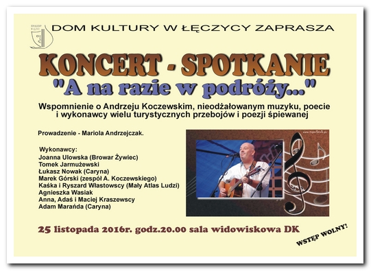 AktualnościDom Kultury w Łęczycy zaprasza 25 listopada o godzinie 20 w sali widowiskowej Domu Kultury na koncert - spotkanie "A na razie w podróży..."Będzie to wspomnienie o Andrzeju Koczewskim, nieodżałowanym muzyku, poecie, i wykonawcy wielu turystycznych przebojów i poezji śpiewanej.Wstęp wolny. Więcej informacji można uzyskać w sekretariacie Domu Kultury lub pod telefonem 24 7210349.
