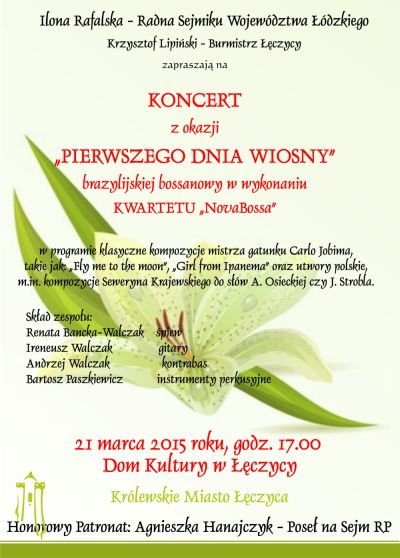 AktualnościIlona Rafalska - Radna Sejmiku Województwa Łódzkiego oraz Krzysztof Lipiński - Burmistrz Łęczycy zapraszają na koncert z okazji "Pierwszego Dnia Wiosny" brazyliskiej bossanowy w wykonaniu kwartetu "NovaBossa".W programie przewiduje się klasyczne kompozycje mistrza gatunku Carlo Jobima, takie jak: "Fly to the moon", "Girl from Ipanema" oraz utwory polskie. Koncert odbędzie się 21 marca 2015 roku o godzinie 17:00 w Domu Kultury w Łęczycy.
