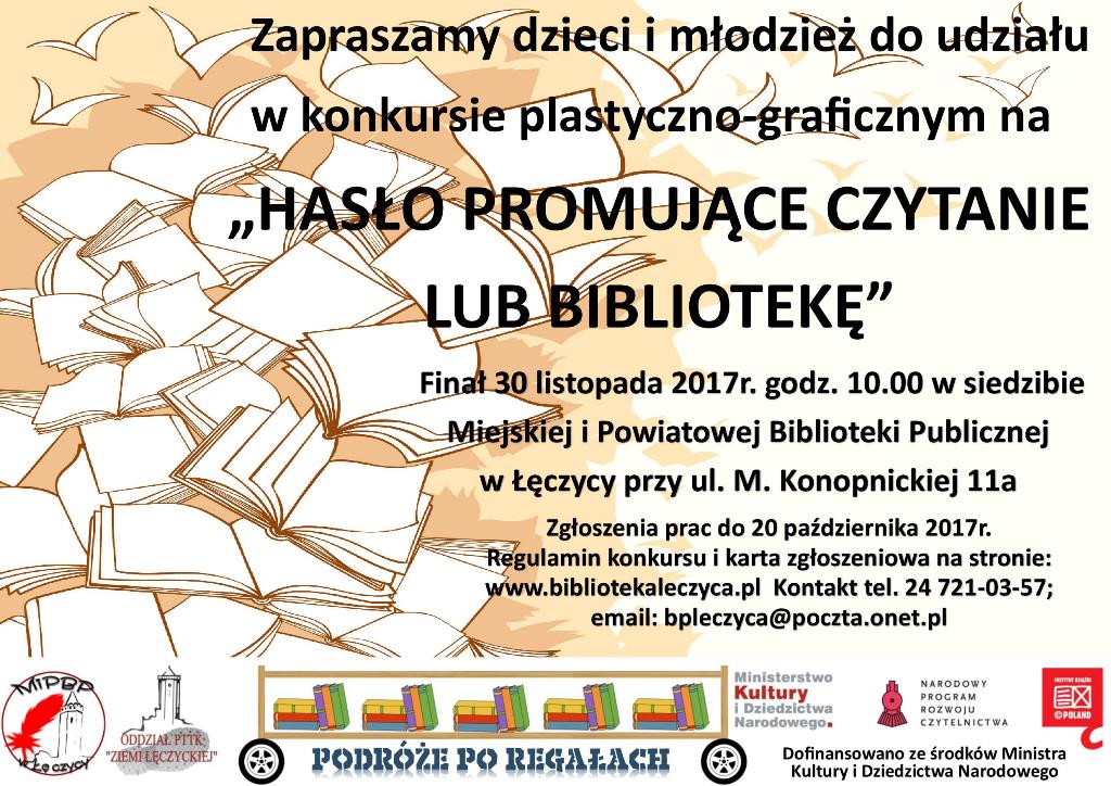 AktualnościZapraszamy Dzieci i Młodzież do udziału w konkursie plastycznym na „HASŁO PROMUJĄCE CZYTANIE LUB BIBLIOTEKĘ”. Zadanie polega na wymyśleniu hasła promującego książkę, czytanie lub bibliotekę. Do hasła należy wykonać rysunek, grafikę, obraz lub logo. Zgłoszenia prac do 20 października 2017 r.Finał konkursu odbędzie się w czwartek 30 listopada 2017 r. o godz. 10.00 w siedzibie Miejskiej i Powiatowej Biblioteki Publicznej w Łęczycy przy ul. M. Konopnickiej 11a.