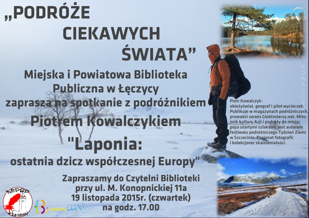 AktualnościMiejska i Powiatowa Biblioteka Publiczna w Łęczycy zaprasza na spotkanie z podróżnikiem Piotrem Kowalczykiem "Laponia: ostatnia dzicz współczesnej Europy".Zapraszamy do Czytelni Biblioteki przy ul. M. Konopnickiej 11a 19 listopada (czwartek) na godz. 17.Piotr Kowalczyk- obieżyświat, geograf i pilot wycieczek. Publikuje w magazynach podróżniczych, prowadzi serwis Globtroterzy.net. Miłośnik kultury Azji i podróży do miejsc poza utartymi szlakami, jest autorem festiwalu podróżniczego Tydzień Ziemi w Szczecinie. Pasjonat fotografii i kolekcjoner skamieniałości.