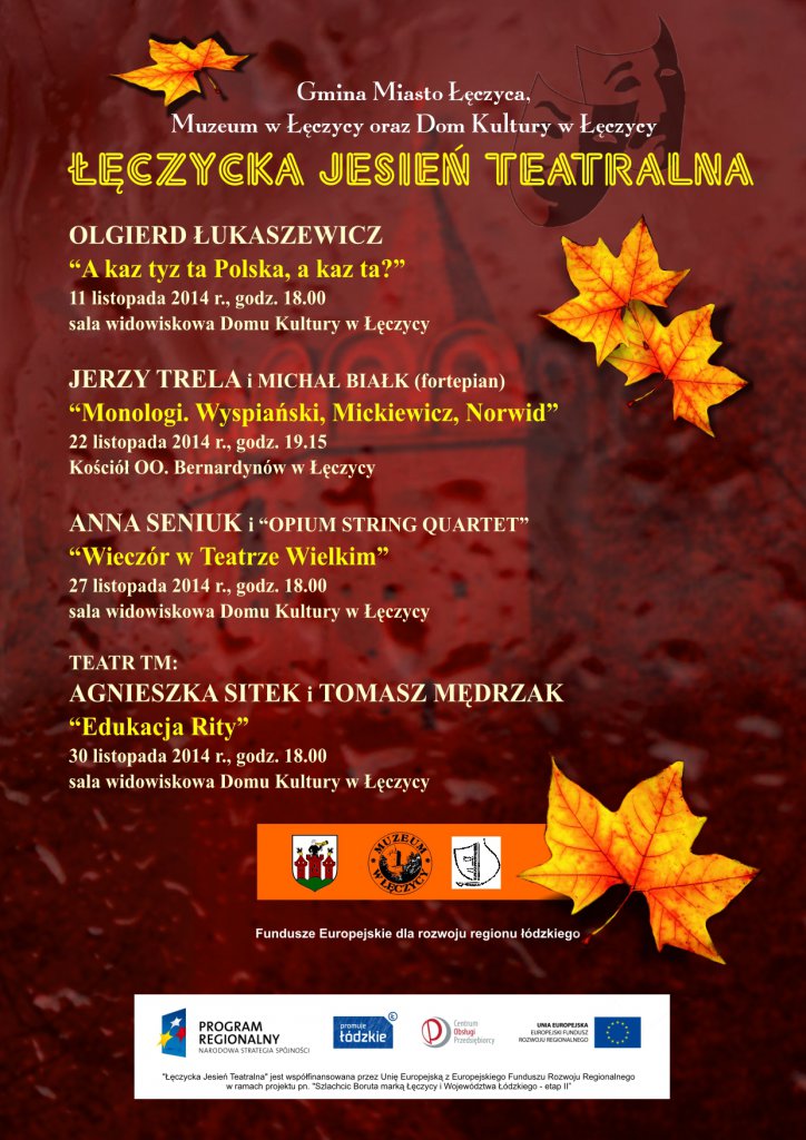 AktualnościGmina Miasto Łęczyca, Muzeum w Łęczycy i Dom Kultury w Łęczycy zaprasza na "Łęczycką Jesień Teatralną". Olgierd Łukaszewicz w spektaklu "A kaz tyz ta Polska, a kaz ta?" - 11 listopada w Domu Kultury w Łęczycy, godz. 18.00.Jerzy Trela i Michał Białk (fortepian) w spektaklu „Monologi. Wyspiański, Mickiewicz, Norwid” – 22 listopada 2014 r., godz. 19.15, kościół OO. Bernardynów w ŁęczycyAnna Seniuk i Opium String Quartet w spektaklu „Wieczór w Teatrze Wielkim” – 27 listopada 2014 r., godz. 18.00, sala widowiskowa Domu Kultury w ŁęczycyTeatr TM Tomasz Mędrzak i Agnieszka Sitek w spektaklu „Edukacja Rity” – 30 listopada 2014 r., godz. 18.00, sala widowiskowa Domu Kultury w Łęczycy.