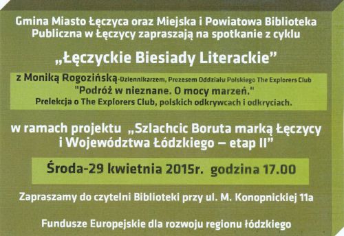 AktualnościGmina Miasto Łęczyca oraz Miejska i Powiatowa Biblioteka Publiczna w Łęczycy zapraszają na spotkanie z cyklu "Łęczyckie Biesiady Literackie" z Moniką Rogozińską (Dziennikarzem, Prezesem Oddziału Polskiego The Explorers Club) ph. "Podróż w nieznane. O mocy marzeń" w ramach projektu "Szlachcic Boruta marką Łęczycy i Województwa Łódzkiego - etap II".Spotkanie odbędzie się w środę, 29 kwietnia o godz. 17:00 w czytelni biblioteki przy ul. M. Konopnickiej 11a.