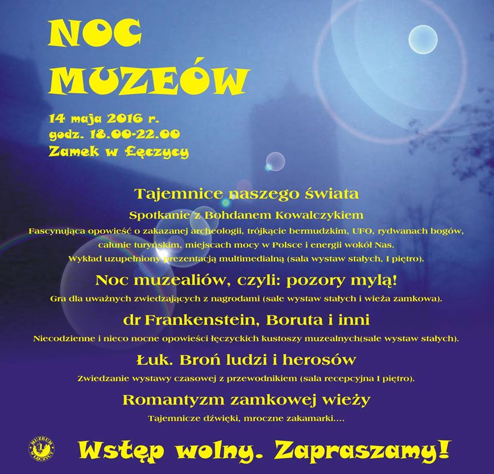 Aktualności14 maja od godz. 18.00 zapraszamy na nietypową, trochę tajemniczą, trochę straszną Noc muzeów na Zamku w Łęczycy.W programie m.in.: opowieści o tajemnicach naszego świata (spotkanie z Bohdanem Kowalczykiem, który zaprezentuje fascynujące historie o zakazanej archeologii, trójkącie bermudzkim, UFO, rydwanach bogów, całunie turyńskim, miejscach mocy w Polsce i energii wokół Nas.Na uważnych zwiedzających czekać będzie nietypowa gra pn. „Noc muzealiów, czyli: pozory mylą”. Muzealni kustosze będą snuć niecodzienne i nieco nocne opowieści o Frankensteinie, Borucie i innych mrocznych postaciach.Wystawa czasowa - Łuk. Broń ludzi i herosów a na okrasę nasza wieża w dość nietypowej scenerii. Opary mgieł, tajemnicze dźwięki, mroczne zakamarki...ZAPRASZAMY!!!