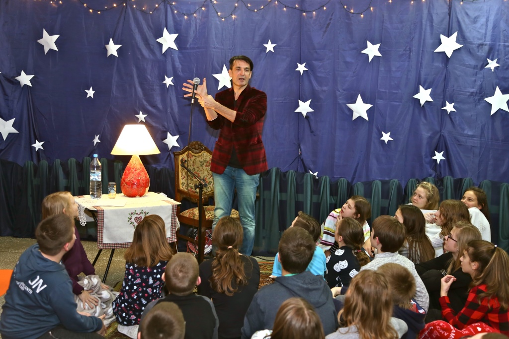 Bohaterką Nocnego Czytania była książka Andrzeja Maleszki pt. Magiczne drzewo. Olbrzym. Obszerny fragment lektury odczytał zaproszony na ten wieczór aktor Teatru Powszechnego w Łodzi, Wojciech Poradowski. Zaangażowanie aktorskie sprawiło, że dzieci z wielkim zainteresowaniem przysłuchiwały się prezentowanym przygodom bohaterów. Następnie miały możliwość porozmawiać z aktorem na temat jego pracy i pasji.