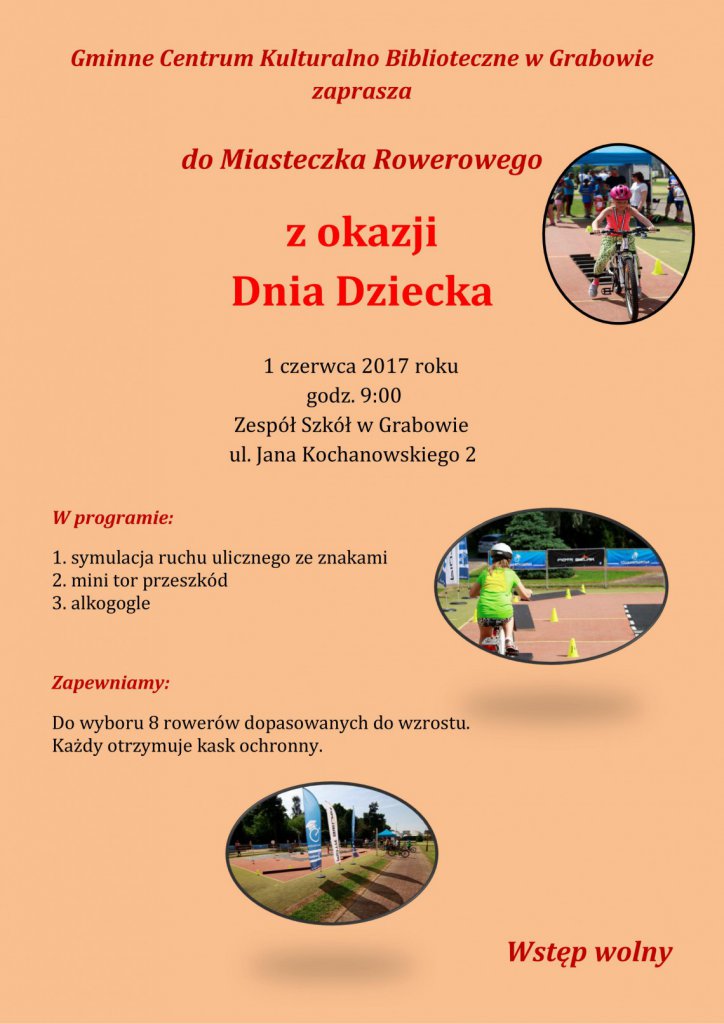 AktualnościGminne Centrum Kulturalno-Biblioteczne w Grabowie zaprasza do Miasteczka Rowerowego z okazji Dnia Dziecka (1 czerwca) na godzinę 9:00 do Zespołu Szkół w Grabowie (ul. Jana Kochanowskiego 2).W programie: - symulacja ruchu ulicznego ze znakami- mini tor przeszkód- alkogogleUczestnikom zapewnione zostanie do wyboru 8 rowerów dopasowanych do wzrostu oraz kask ochrony. Wstęp wolny.