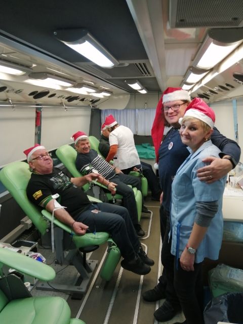 4 grudnia 2019 roku przed budynkiem łęczyckiej Policji ponownie zawitał mobilny punkt poboru krwi RCKiK w Łodzi. Tym razem policjanci chcąc uczcić dzień św. Mikołaja wraz z przedstawicielami Klubu HDK PCK „Strażak” połączyli siły, aby nieść pomoc potrzebującym. Na miejscu zbiorki zgłosiły się 24 osoby. Po weryfikacji 21 darczyńców wcielając się w rolę św. Mikołaja zasiadło na fotelach krwiobusu, oddając po 450 ml życiodajnego płynu. W ten prosty sposób 21 „prezentów” zasili łódzki bank krwi, a co najważniejsze uratują ludzkie życie. Dodatkowo, poza oddaniem części siebie, krwiodawcy wspomogli Dom Małego Dziecka w Łodzi przekazując na jego rzecz najpotrzebniejsze przedmioty. Miłym akcentem towarzyszącym akcji było wręczenie w dowód uznania za najpiękniejszy dar humanitarny – bezinteresowne oddawanie krwi - Odznaki III Stopnia Zasłużony Honorowy Dawca Krwi funkcjonariuszowi KPP w Łęczycy. Otrzymał ją asp. Krzysztof Góra, który ma już na swoim koncie oddane ponad 7 litrów krwi. Po raz kolejny udowodniliśmy, że warto pomagać, a hasło „Łączy nas krew….” sprawdza się w tym najlepiej. Dziękujemy, że jesteście z nami.