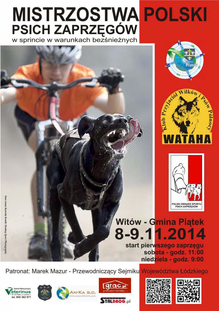 AktualnościKlub Przyjaciół Wilków i Psów Północy WATAHA oraz Wójt Gminy Piątek zapraszają na Mistrzostwa Polski Psich Zaprzęgów w sprincie w warunkach bezśnieżnych, które odbędą się w dniach 8-9 listopada 2014 r. w Witowie - Gmina Piątek.Start pierwszego zaprzęgu: sobota, 8 listopada 2014 r. - godz. 11:00, niedziela, 9 listopada 2014 r. - godz. 9:00.