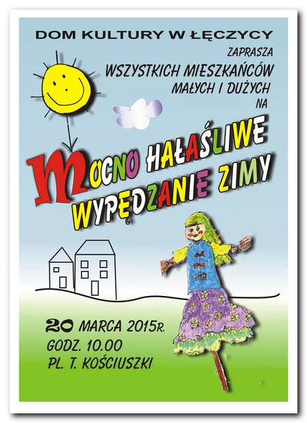 AktualnościDom Kultury w Łęczycy zaprasza wszystkich mieszkańców małych i dużych na "Mocno hałaśliwe wypędzanie zimy".Impreza odbędzie się 20 marca 2015r. o godzinie 10:00 na pl. T. Kościuszki