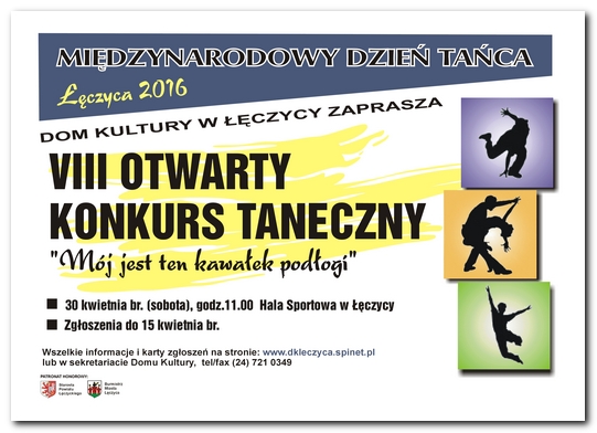 AktualnościDom Kultury w Łęczycy zaprasza na VIII Otwarty Konkurs Taneczny "Mój jest ten kawałek podłogi".Odbędzie się on 30 kwietnia o godzinie 11 w Hali Sportowej w Łęczycy. Zgłoszenia nadsyłać można do 15 kwietnia.Do pobrania regulamin konkursu - tutaj. Do pobrania karta zgoszenia dla solistów - tutaj. Do pobrania karta zgoszenia dla zespołów - tutaj.