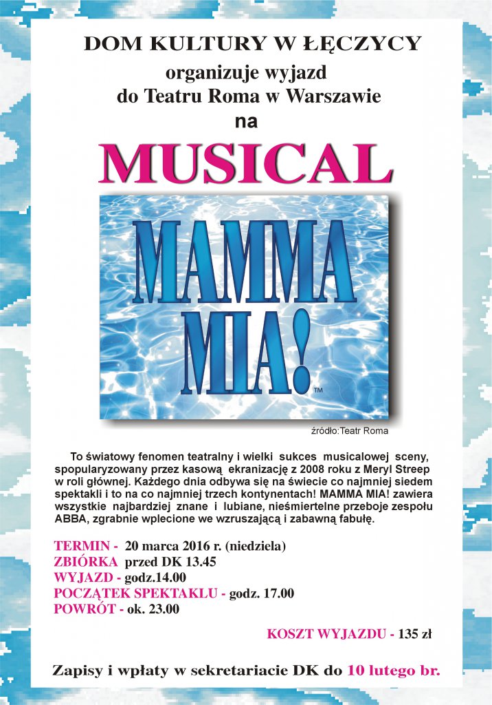AktualnościDom Kultury w Łęczycy organizuje wyjazd do teatru Roma w Warszawie na musical "Mamma Mia".Wyjazd odbędzie się 20 marca, zbiórka przed Domem Kultury o godzinie 13.45. Spektakl rozpocznie się o godz. 17, natomiast powrót o godz. 23.
