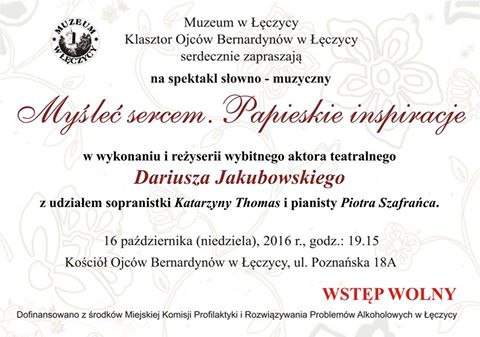 AktualnościMuzeum w Łęczycy oraz ojcowie Bernardyni gorąco zapraszają miłośników sztuki na spektakl słowno-muzyczny pt. "Myśleć sercem - Papieskie inspiracje", który odbędzie się 16 października (niedziela) w kościele OO. Bernardynów (ul. Poznańska 18A) o godzinie 19:15.Spektakl słowno - muzyczny w wykonaniu i reżyserii wybitnego aktora teatralnego Dariusza Jakubowskiego (popularność telewizyjną przyniosły mu seriale m.in.: Na dobre i na złe, Ekstradycja, Klan, Wiedźmin) z udziałem sopranistki Katarzyny Thomas i pianisty Piotra Szafrańca. Zaprezentowany zostanie w niedzielę wieczór w zabytkowym wnętrzu kościoła Bernardynów w Łęczycy, słynącym nie tylko z barokowego piękna, ale i ze znakomitej akustyki. Spektakl ten będzie niewątpliwie prawdziwą ucztą duchową i kulturalną, zrozumiałą jednocześnie dla szerokiej publiczności i jednocześnie wydarzeniem kulturalnym o znaczeniu prestiżowym dla miasta Łęczycy.