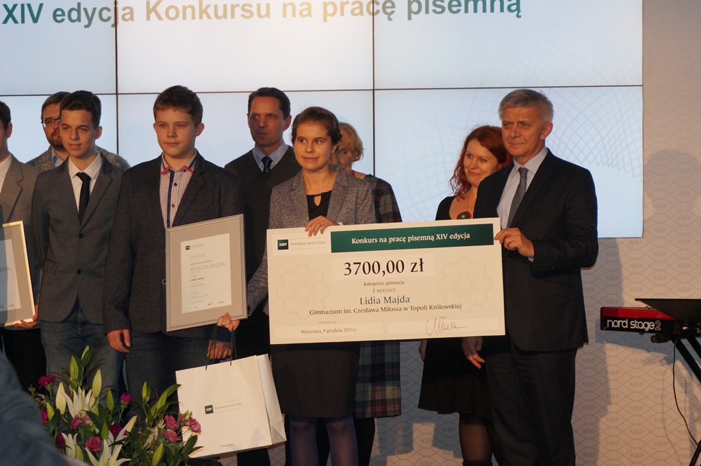 Aktualności9 grudnia w Narodowym Banku Polskim w Warszawie odbyła się gala finałowa podsumowująca ogólnopolski konkurs NBP na pracę pisemną o tematyce ekonomicznej „Kooperatywa z sukcesem – pomysł na wspólny biznes, spełniający potrzeby społeczności lokalnej".Nagrodę za zdobycie I miejsca w konkursie z rąk prezesa NBP Marka Belki, otrzymała Lidia Majda, szefowa Szkolnego Klubu Przedsiębiorczości działającego w Gimnazjum im. Cz. Miłosza w Topoli Królewskiej.