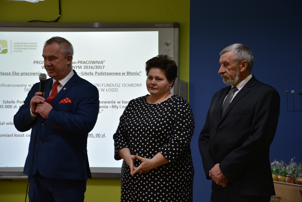 Uroczystość rozpoczęła się od przedstawienia zaproszonych gości wśród których znaleźli się: Wiesław Łukomski – zastępca prezesa Zarządu WFOŚiGW w Łodzi, Jacek Rogoziński - wójt gminy Łęczyca, Włodzimierz Starzyński – przewodniczący Rady Gminy Łęczyca, Jadwiga Frątczak – zastępca przewodniczącego Rady Gminy Łęczyca, Andrzej Piłacik – kierownik Referatu Oświaty Gminy Łęczyca, Wojciech Frankowski - Państwowy Powiatowy Inspektor Sanitarny w Łęczycy, ks. Krzysztof Wasiak – proboszcz Parafii p.w. Najświętszego Serca Pana Jezusa w Błoniu, dyrektorzy szkół z terenu Gminy Łęczyca oraz przedstawicielki Rady Rodziców ze Szkoły Podstawowej w Błoniu.