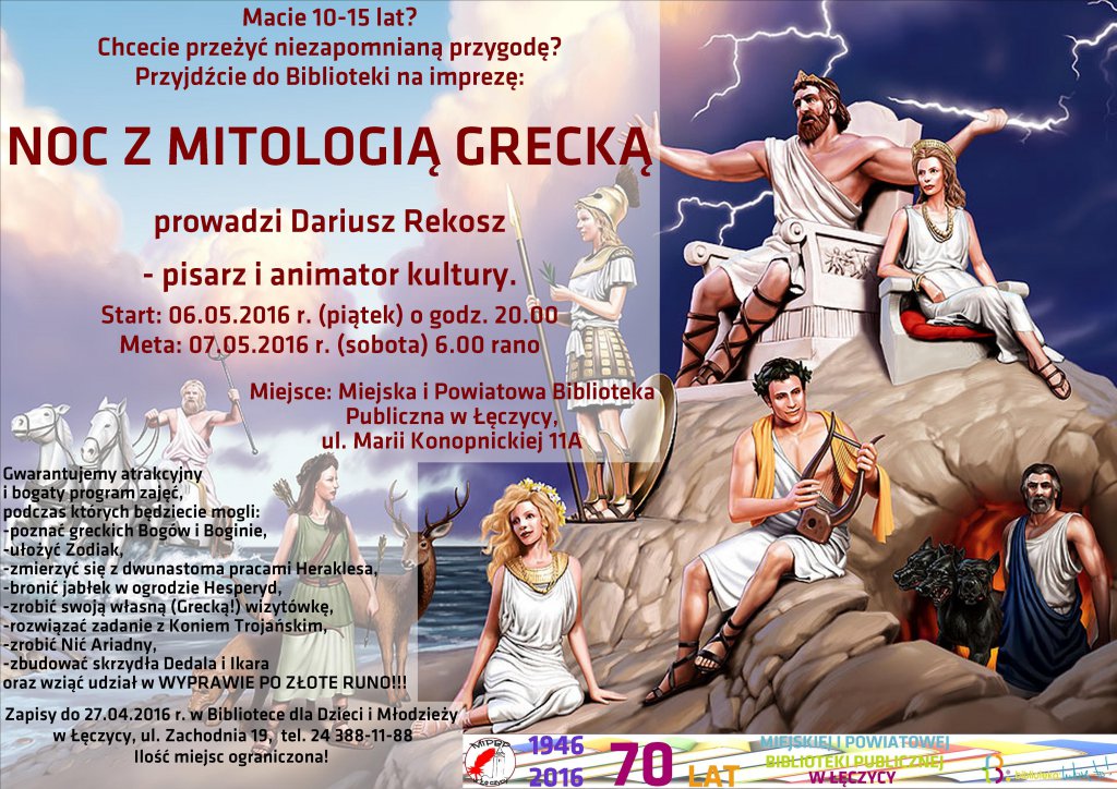 AktualnościMiPBP w Łęczycy zaprasza na noc z mitologią grecką. Prowadzi Dariusz Rekosz - pisarz i animator kultury.Start 6 maja o godzinie 20, natomiast zakończenie 7 maja o godzinie 6 rano.
