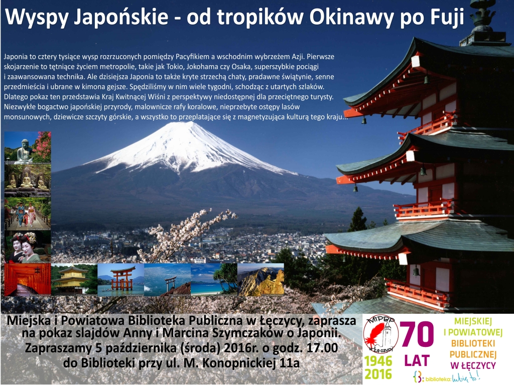 AktualnościMiejska i Powiatowa Biblioteka Publiczna w Łęczycy zaprasza na pokaz slajdó Anny i Marcina Szymczaków o Japonii.Spotkanie odbędzie się 5 października o godzinie 17 w bilbiotece.