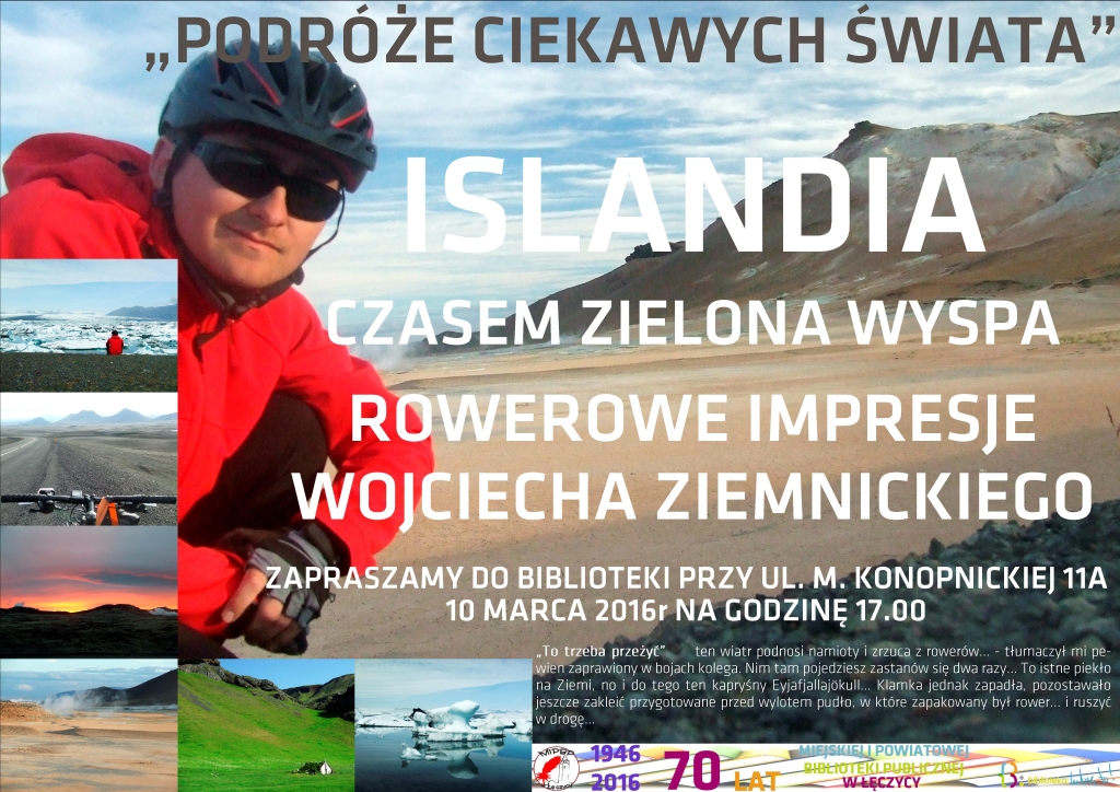 AktualnościMiejska i Powiatowa Biblioteka Publiczna w Łęczycy zaprasza na kolejne spotkanie z cyklu "Podróże Ciekawch Świata", które będzie miało miejsce 10 marca o godz. 17. Wojciech Ziemnicki będzie opowiadał o wulkanicznym zakątku Europy- Islandii.