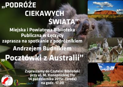 Aktualności14 października Miejska i Powiatowa Biblioteka Publiczna w Łęczycy organizuje kolejne spotkanie w ramach cyklu „Podróże Ciekawych Świata”.Tym razem będzie można spotkać się z podróżnikiem Andrzejem Budnikiem, który opowie o swoich podróżach do Australii. Spotkanie rozpocznie się o godzinie 17 w Czytelni Biblioteki przy ul. M. Konopnickiej 11a.