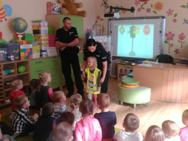 Mundurowi uczulili też małych słuchaczy na zagrożenia które mogą wynikać z kontaktu z obcymi osobami i w jaki sposób należy reagować na niebezpieczne sytuacje. Przypomnieli dzieciom numery telefonów alarmowych i udzielili kilku wskazówek w jakich sytuacjach należy z nich korzystać. Funkcjonariusze rozmawiali też o właściwym obchodzeniu się ze zwierzętami domowymi i gospodarskimi. Pokazali również sposoby uniknięcia ataku przypadkowo napotkanego psa.