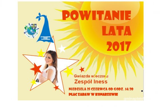 AktualnościStowarzyszenie Kobiet w Konarzewie oraz Gmina Piątek zapraszają w niedzielę 25 czerwca 2017 r., od godz. 14:30 na plac zabaw w Konarzewie na festyn "Powitanie lata". Patronat na impreza objęła Izba Rolnicza Województwa Łódzkiego. Głównym sponsorem jest Bank Spółdzielczy Ziemi Łęczyckiej w Łęczycy, Oddział w Piątku.Współorganizatorzy: Magdalena Marciniak-dyplomowana masażystka, Terapeuta Spa, Zagroda edukacyjna Wiklina Teresa Maciejak w Konarzewie i zagroda edukacyjna Stajnia Lusi w Konarzewie. Patronat medialny: "w nowej Roli" oraz Nasz Tygodnik.W programie:- Mecz piłki nożnej o puchar Prezesa IRWŁ,- Występy artystyczne,- Pokaz Łódzkiego Klubu Karate Kyokushin Sekcja Piątek,- Konkursy: fotograficzny, plastyczny, na najładniejszy wianek z kwiatów polnych,- Darmowe masaże.Ponadto: kawiarenka z domowymi ciastami, punkt gastronomiczny, atrakcje dla dzieci, wystawcy firmowi, wystawa twórców ludowych regionalnych i „Pergaminowej Pasji” i świeże powietrze.Gwiazda wieczoru - Zespół InessZapraszamy!